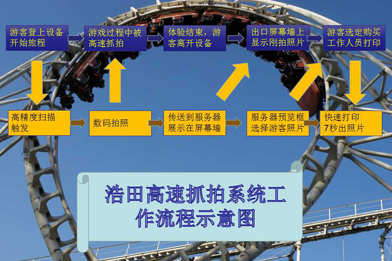 自動檢測 → 觸發并拍攝 → 自動傳輸→ 終端自動讀取照片信息→屏幕顯示→游客下車后瀏覽照片 → 游客做出選擇 → 自動打印 → 領取包裝照片